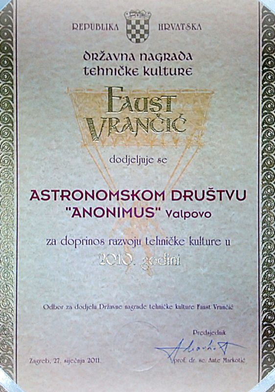 Astronomical society “Anonymus” is a non-profit organization, situated and operating in the Republic of Croatia. Initially an unregistered group of citizens, it was founded in November 1994 within (then known as) the Technical Culture Community in Valpovo, and as of 2001 it has been registered as a non-profitable organization, with its headquarters in the House of Technical Culture in the city of Valpovo.